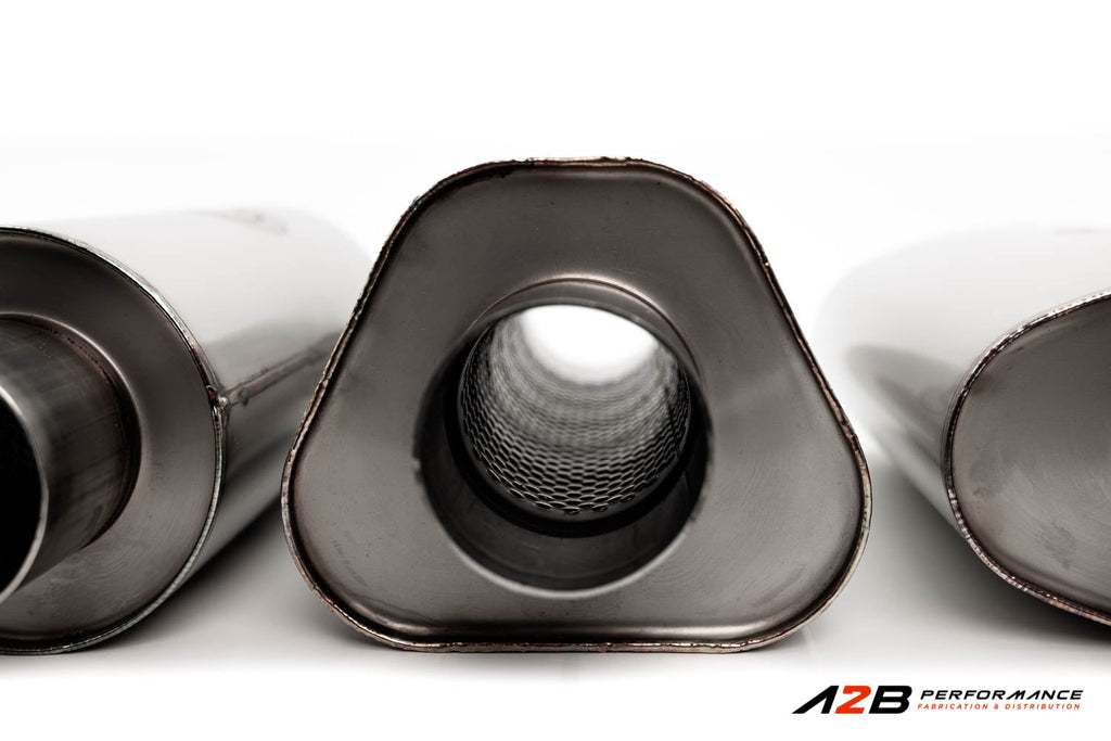 The Series TR triangular body design is engineered specifically to fit higher within the driveshaft tunnel, particularly in front-wheel-drive vehicles, where traditional round mufflers may hang lower.