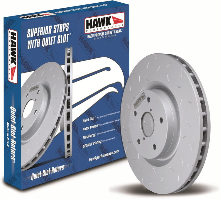 Get quiet stops with the all-new Quiet Slot rotors by Hawk Performance. Quiet Slot rotors are engineered specifically for automotive car and truck enthusiasts looking for high performance braking without the noise, dust and reliability issues commonly seen in heavily slotted, dimpled or cross-drilled aftermarket rotors. Some of the key features of the all-new Quiet Slot rotors are the advanced metallurgy, surface finish, and progressive structural and aerodynamic design. The Quiet Slot rotor program also addresses the needs of the automotive distributor and installer. The unidirectional vane and slot design eliminates the need to stock left hand and right hand rotors. This feature presents an immediate financial impact to distributors that currently inventory directional rotors. Hawk Performance has also taken measures to decrease the impact of automotive products on the environment. All Quiet Slot rotors are finished with a GEOMET coating that protects both the internal and external surfaces from rust and corrosion. GEOMET is a proprietary water-based coating dispersion containing metal oxides, metallic zinc and aluminum flakes. The zinc and aluminum platelets align in multiple layers forming a metallic silver-gray coating. Applied as a liquid, the coating becomes totally inorganic after curing at 575-600 degree Fahrenheit. (300-315 degree centigrade).