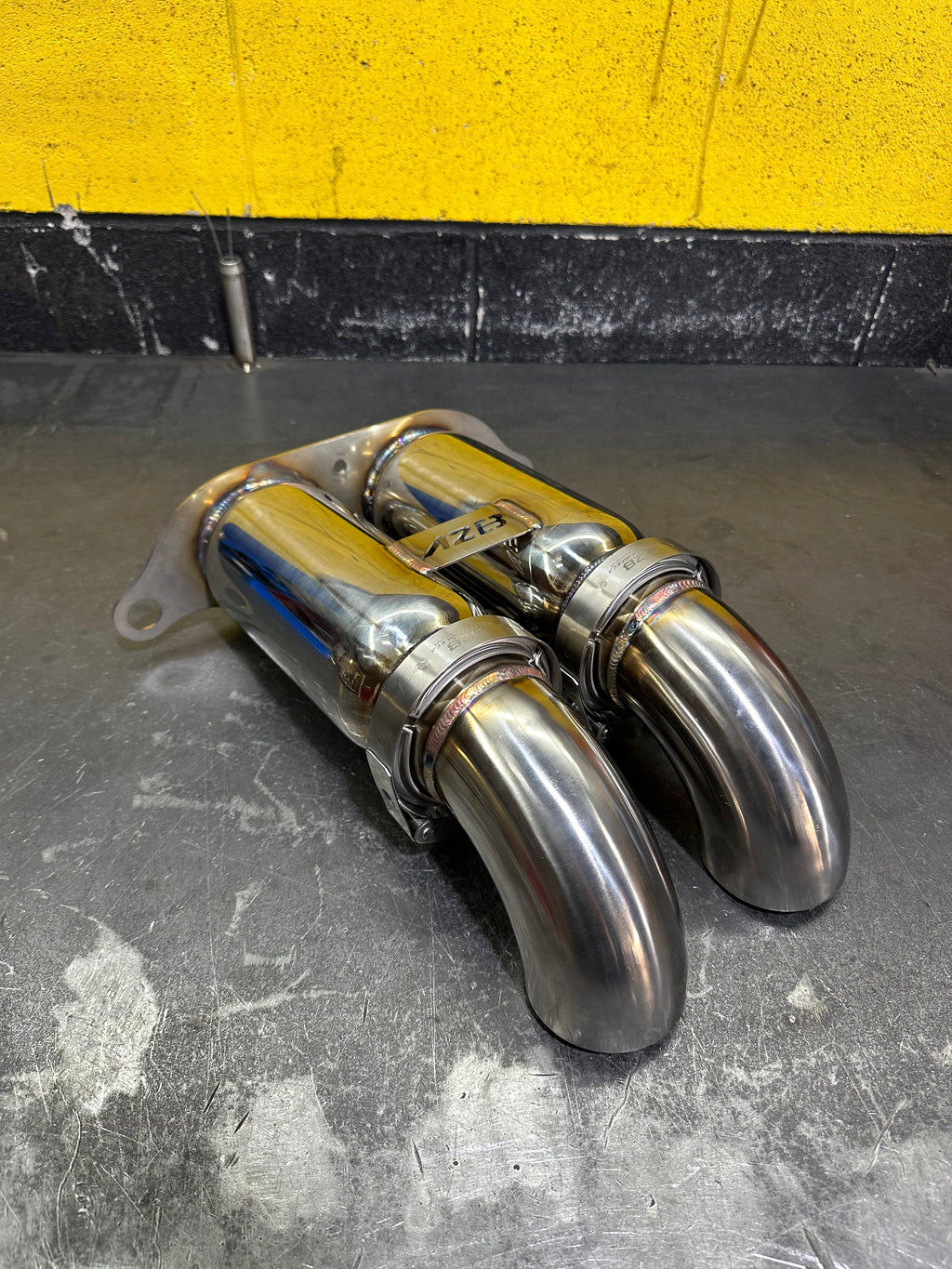 An aftermarket secondary exhaust using the original mounting plate